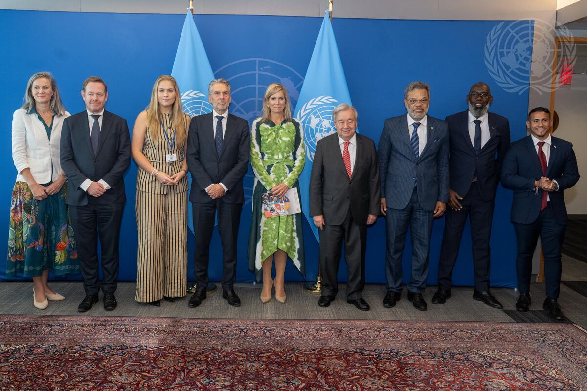 Secretary-General António Guterres (centre right) meets with Queen Máxima of the Netherlands (centre), Hendrikus Wilhelmus Maria Dick Schoof (centre left), Prime Minister, Kingdom of the Netherlands, Catharina-Amalia Beatrix Carmen Victoria, Princess of Orange (third from left), Lise Gregoire-van Haaren (left), Permanent Representative of the Kingdom of the Netherlands to the United Nations, Gilmar Pisas (second from right), Prime Minister, Curaҫao, and Luc Mercelina (third from right), Prime Minister, Sint Maarten.