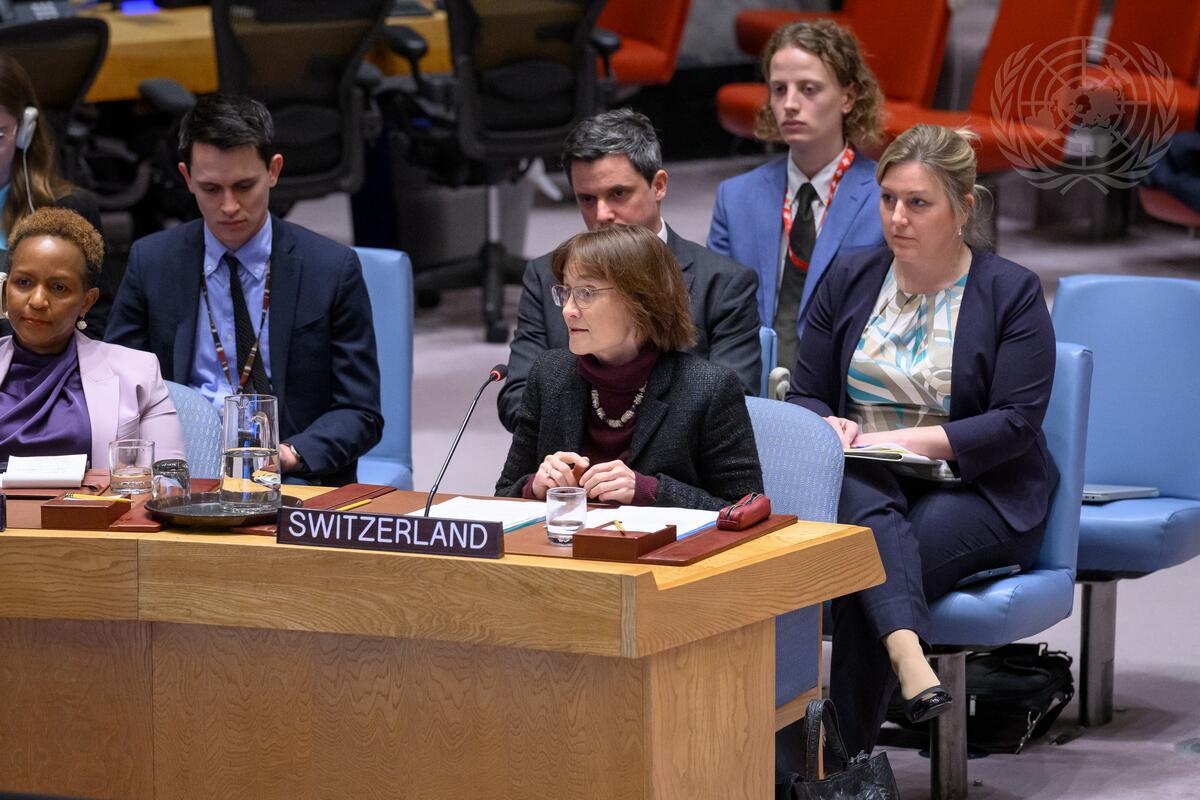 Pascale Baeriswyl (at end of table), Permanent Representative of Switzerland to the United Nations, addresses the Security Council meeting on protection of civilians in armed conflict.