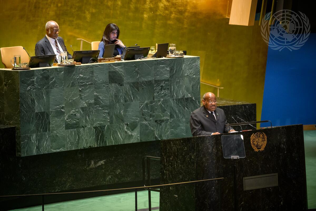 Anatolio Ndong Mba, Vice President of the Economic and Social Council and Permanent Representative of the Republic of Equatorial Guinea to the United Nations, addresses the high-level meeting on Middle-Income Countries of the General Assembly on the theme “Addressing Structural Barriers to Sustainable Development in Middle-Income Countries”. Behind at dais is Philemon Yang (left), President of the seventy-ninth session of the United Nations General Assembly.