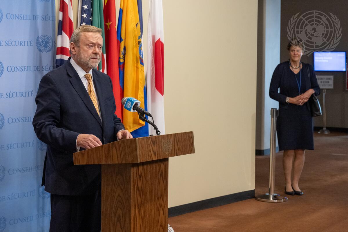 Ray Collins (at podium), Parliamentary Under-Secretary of State for the Foreign, Commonwealth and Development Office of United Kingdom and President of the Security Council for the Month of November, briefs reporters after the Security Council meeting on the situation in the Sudan and South Sudan. At right is Barbara Woodward, Permanent Representative of the United Kingdom to the United Nations.