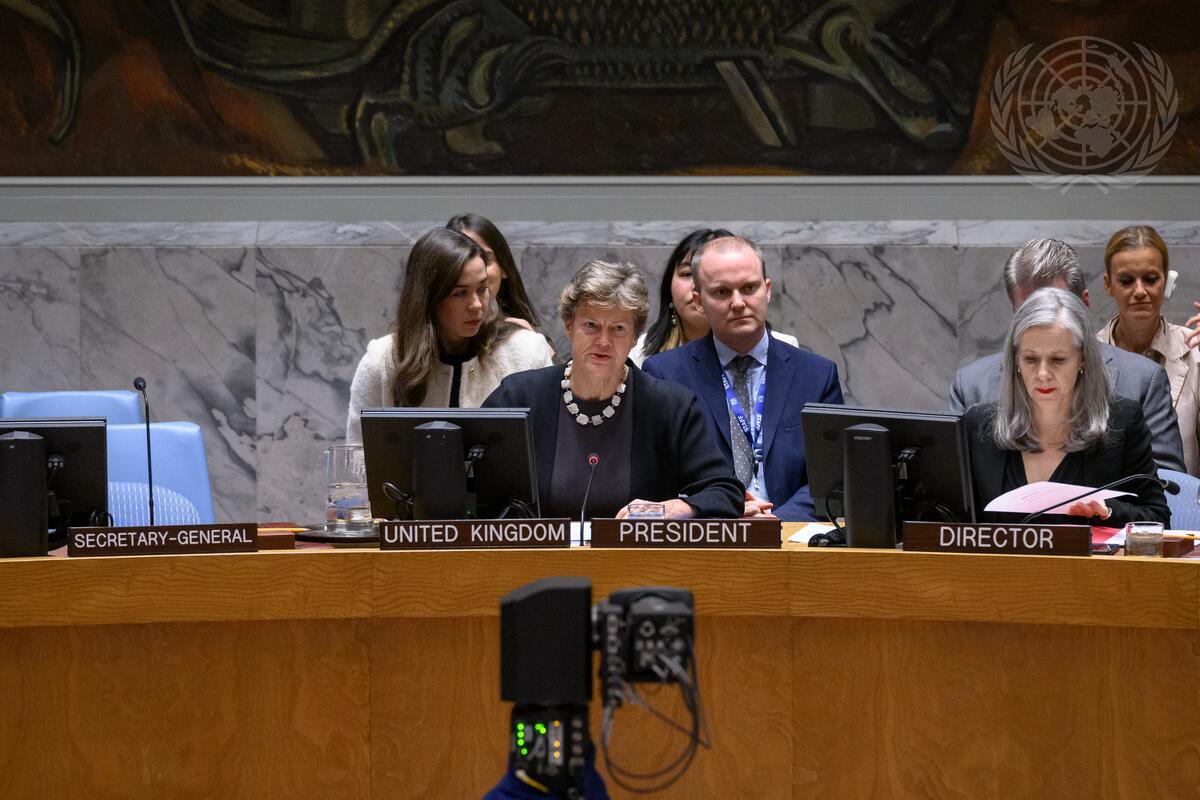 Barbara Woodward, Permanent Representative of the United Kingdom to the United Nations and President of the Security Council for the Month of November, chairs the Security Council meeting on the situation in the Middle East, including the Palestinian question. At right is Claudia Banz, Director of the Security Council Affairs Division of the Department of Political and Peacebuilding Affairs (DPPA).
