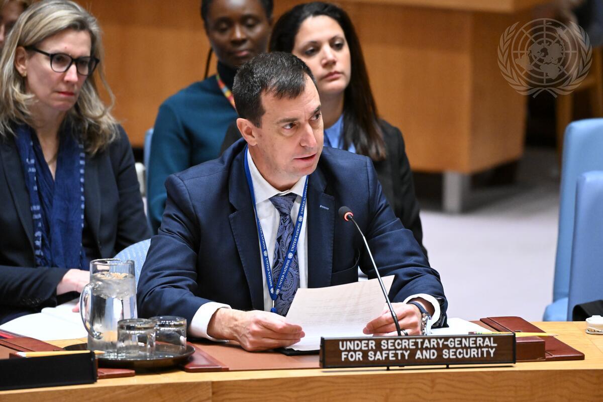 Gilles Michaud, Under-Secretary-General for Safety and Security of the UN Department of Safety and Security (DSS), briefs the Security Council meeting on protection of civilians in armed conflict.