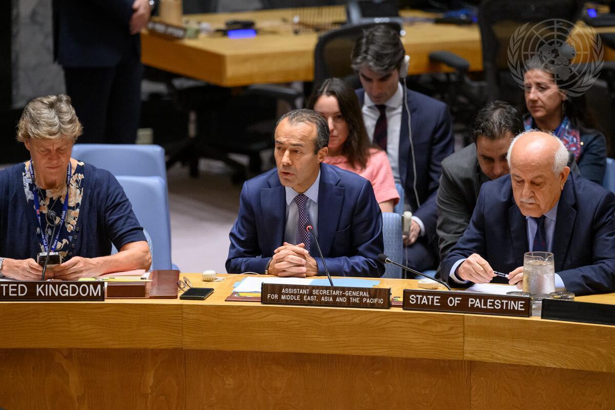 Khaled Khiari (centre), Assistant Secretary-General for the Middle East, Asia and the Pacific, Departments of Political and Peacebuilding Affairs and Peace Operations, briefs the Security Council meeting on the situation in the Middle East, including the Palestinian question. At right is Riyad Mansour, Permanent Observer of the State of Palestine to the United Nations, and at left is Barbara Woodward, Permanent Representative of the United Kingdom to the United Nations.