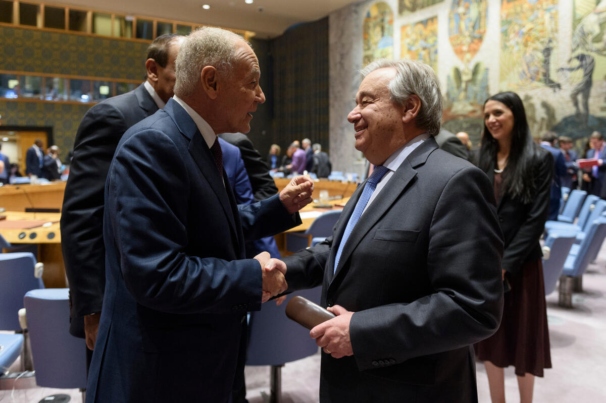 Secretary-General António Guterres (right) speaks with Ahmed Aboul Gheit, Secretary-General of the League of Arab States, prior to the Security Council meeting on cooperation between the Council and the League of Arab States.