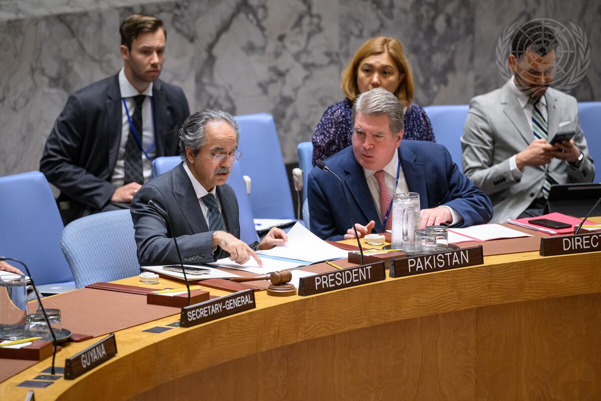 Asim Iftikhar Ahmad (left at table), Permanent Representative of Pakistan to the United Nations and President of the Security Council for the month of July, chairs the Security Council meeting on the situation in the Middle East (Syria).