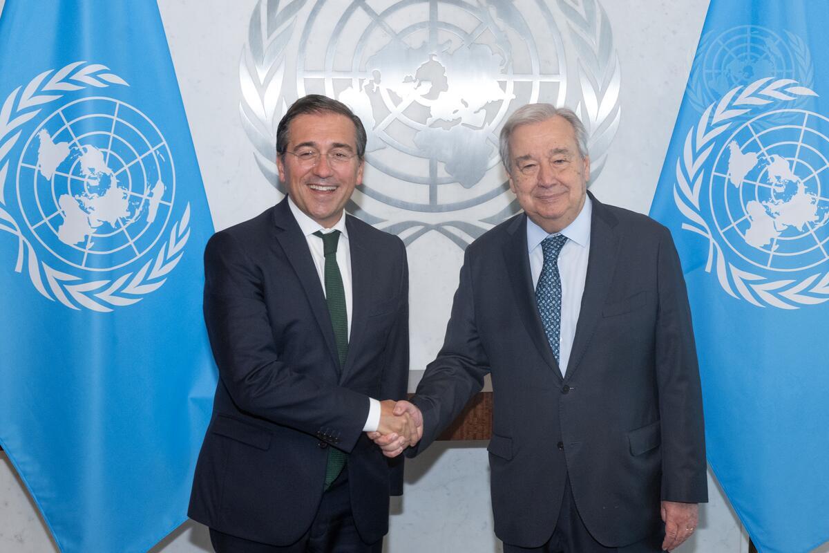 Secretary-General António Guterres (right) meets with José Manuel Albares Bueno, Minister for Foreign Affairs, European Union and Cooperation of Spain.