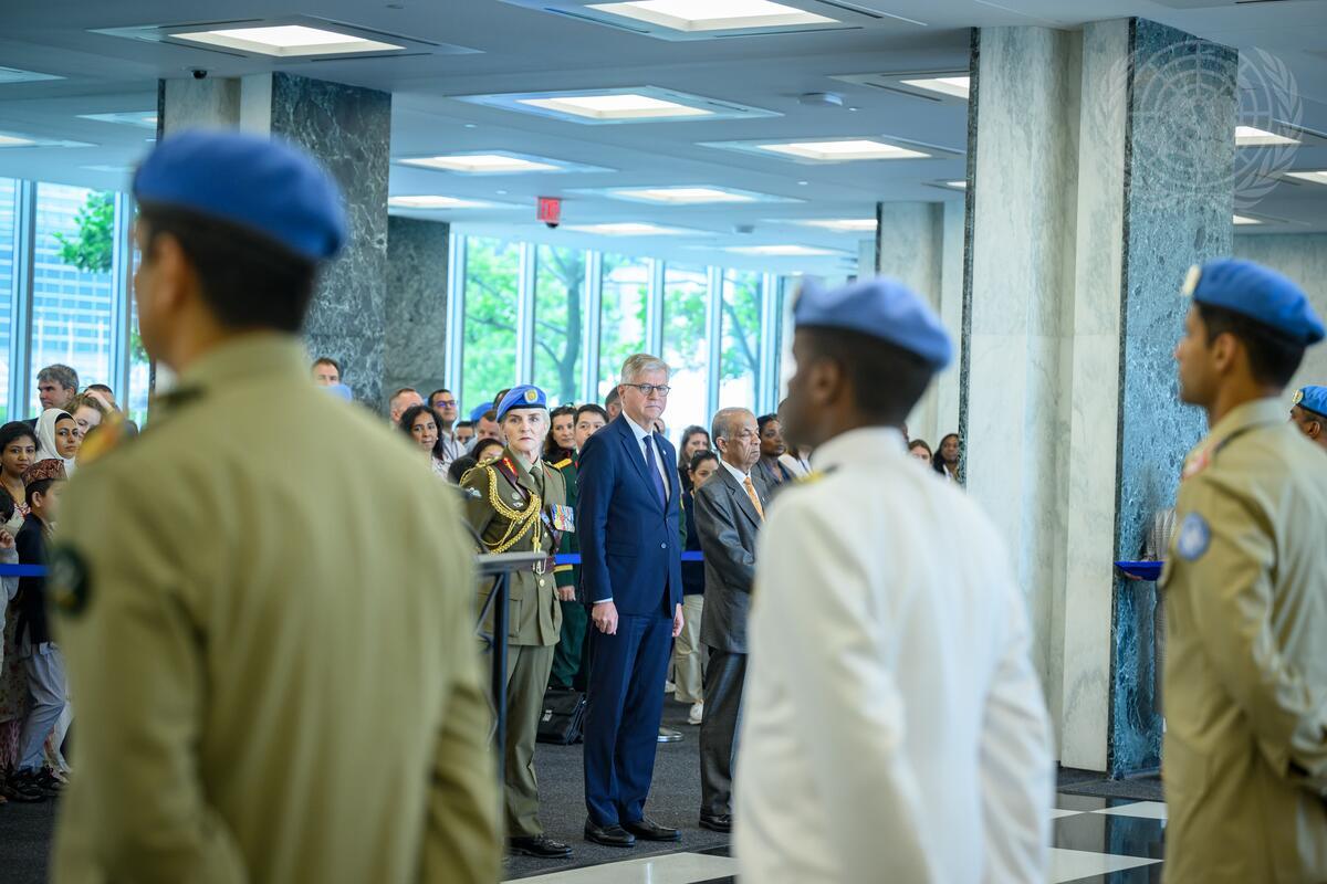Jean-Pierre Lacroix (centre facing camera), Under-Secretary-General for Peace Operations, and Atul Khare, Under-Secretary-General for Operational Support, attend the Peacekeeping Military Police Medal Award Ceremony on the International Day of UN Peacekeepers (29 May).