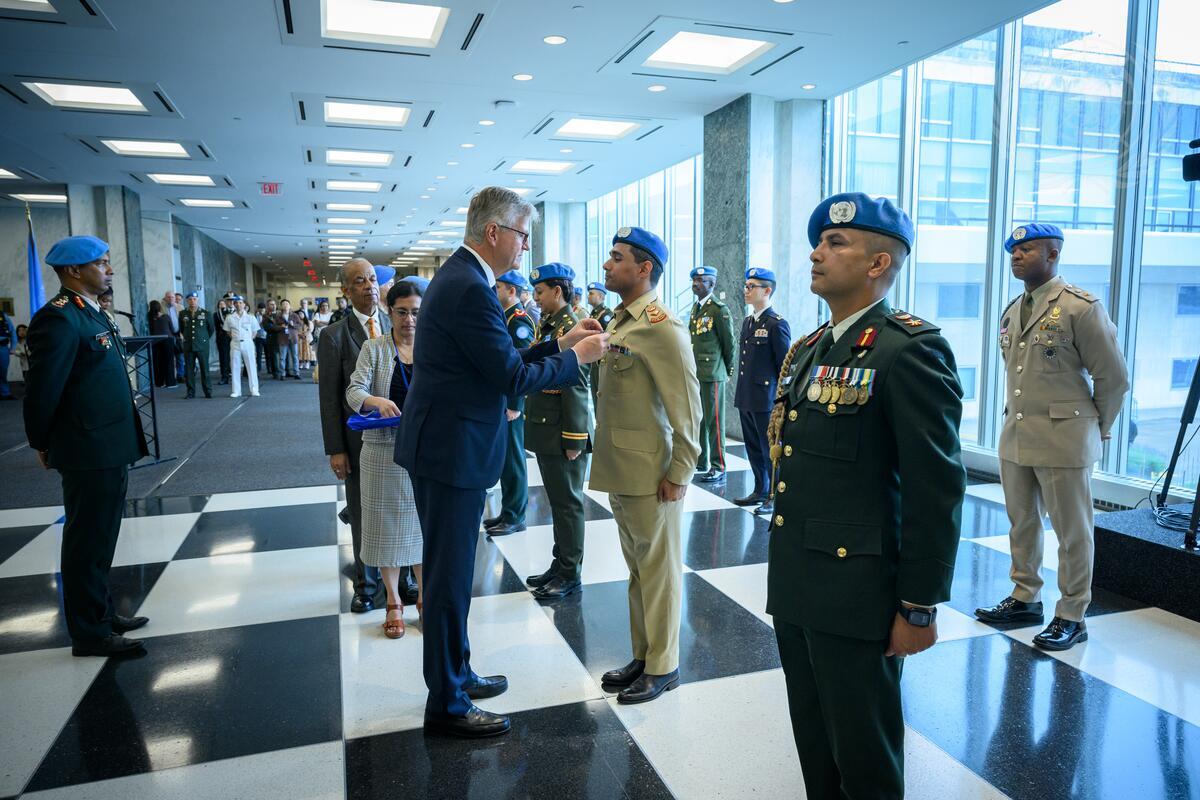 Jean-Pierre Lacroix (centre left), Under-Secretary-General for Peace Operations, awards a medal during the Peacekeeping Military Police Medal Award Ceremony on the International Day of UN Peacekeepers