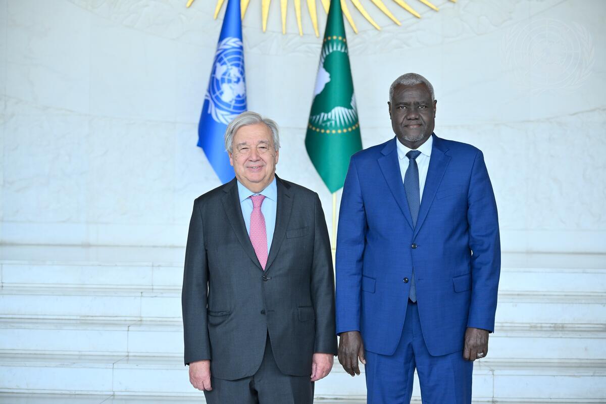 Secretary-General António Guterres (left) and Moussa Faki Mahamat, the Chairperson of the African Union Commission, pose for a photo during the 8th African Union–United Nations annual conference in Addis Ababa.