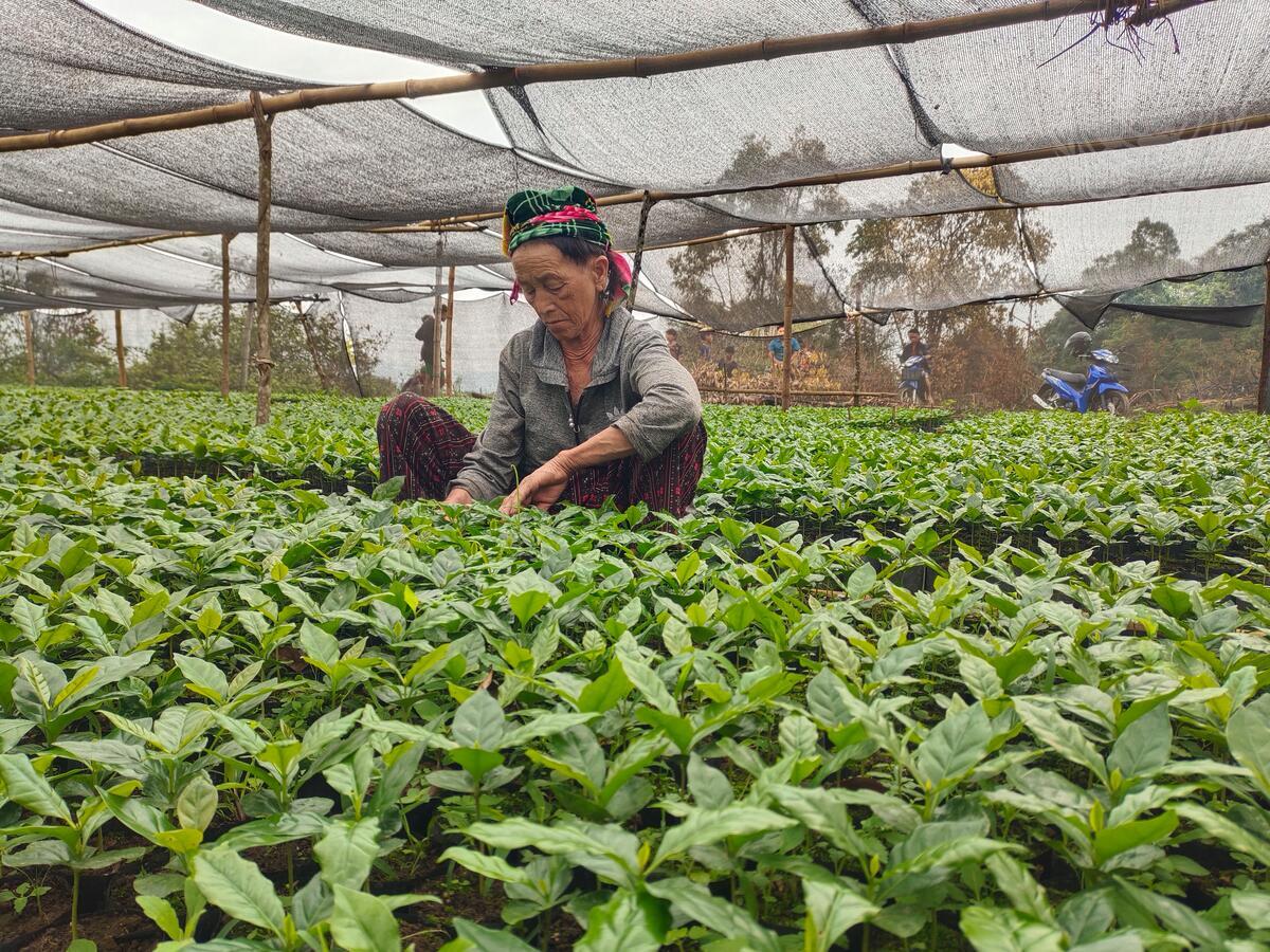 A UNODC programme participant examines coffee seedlings at a nursery in Kuan District, Laos.