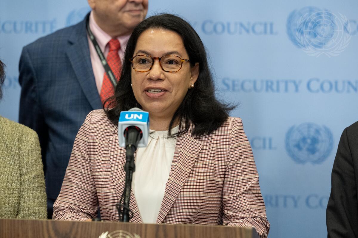 Carolyn Rodrigues-Birkett, Permanent Representative of Guyana to the United Nations, briefs reporters on behalf of the E10 (non-permanent members of the Security Council) on the situation in the Middle East.