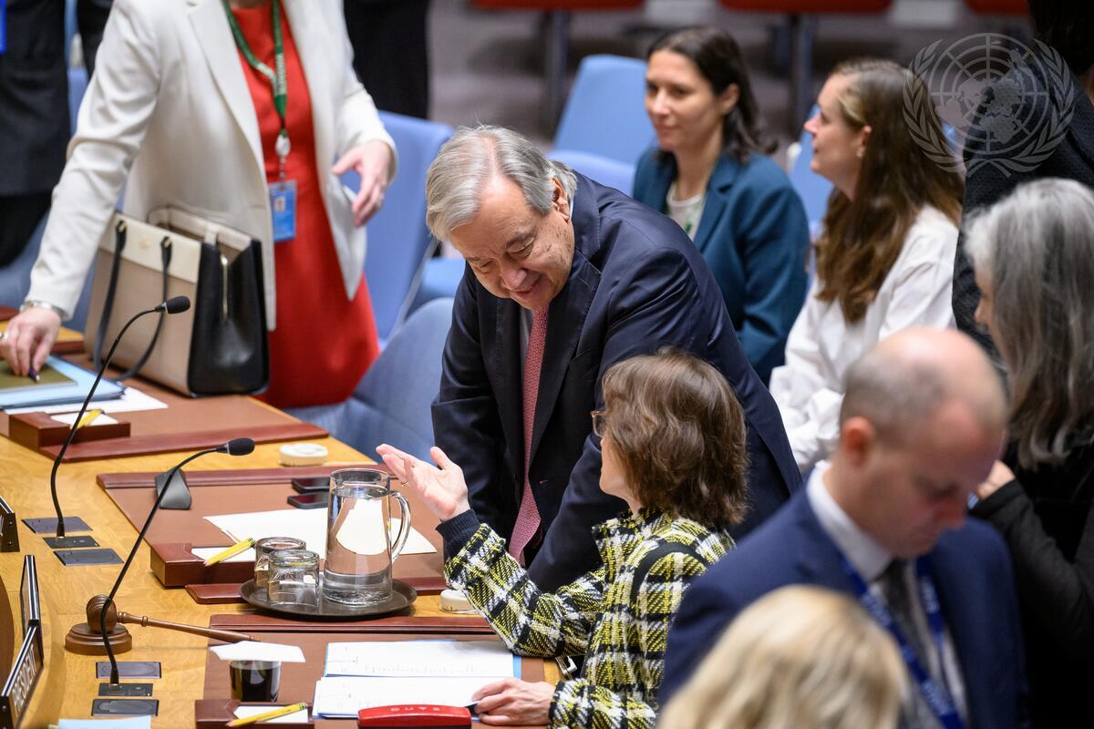 Pascale Christine Baeriswyl (seated), Permanent Representative of Switzerland to the United Nations and President of the Security Council for the Month of October, speaks with Secretary-General António Guterres ahead of the Security Council meeting on the situation in the Middle East.