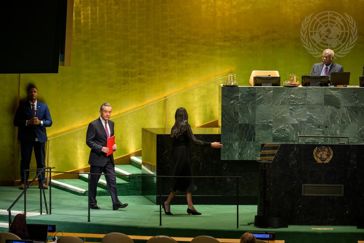 Wang Yi (second from left), Member of the Political Bureau of the CPC Central Committee, Director of the Office of the Central Commission for Foreign Affairs and Minister for Foreign Affairs of China, walks to the podium to address the general debate of the General Assembly’s seventy-ninth session.