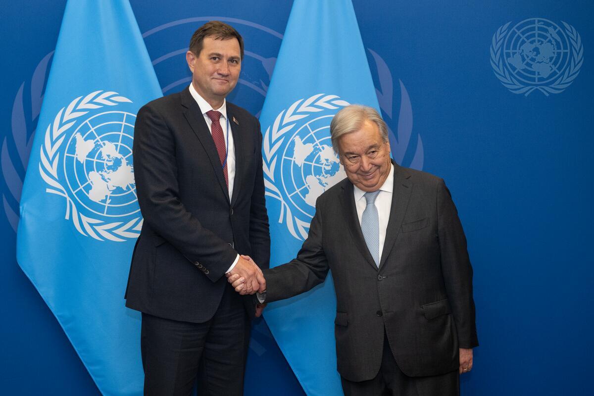 Secretary-General António Guterres (right) meets with Maxim Ryzhenkov, Minister for Foreign Affairs of Belarus.