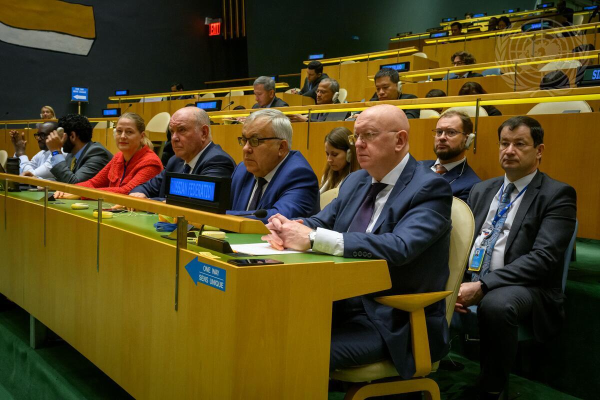 Vassily Nebenzia (right in front row), Permanent Representative of the Russian Federation; Vershinin Sergey Vasilievich (second from right in front row), Deputy Minister of Foreign Affairs of the Russian Federation; and Dmitry Polyanskiy (right, second row), Deputy Permanent Representative of the Russian Federation to the United Nations, attend the general debate of the General Assembly’s seventy-ninth session as Sergey Lavrov (not pictured), Minister for Foreign Affairs of the Russian Federation, addresses the Assembly.