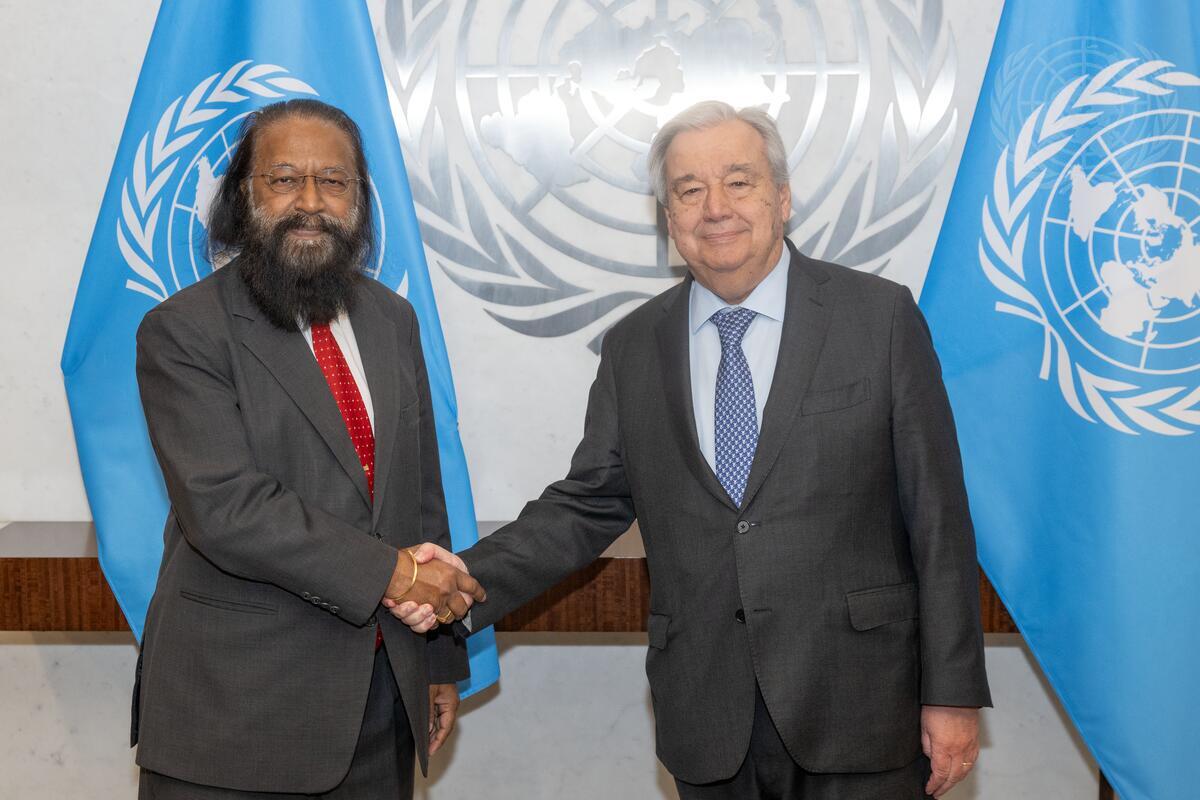 Jagdish Dharamchand Koonjul (left), Permanent Representative of the Republic of Mauritius to the United Nations, pays a farewell call on Secretary-General António Guterres.