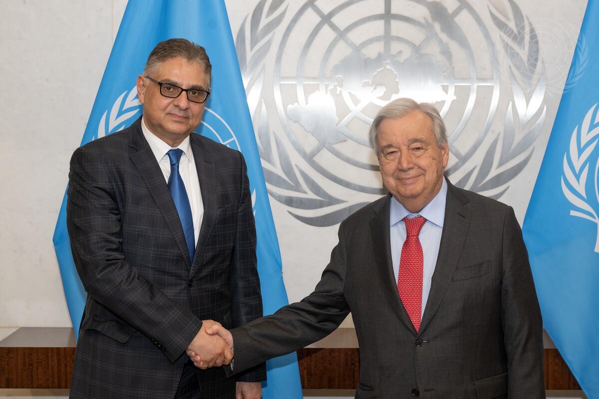 UN Secretary-General António Guterres (right) meets with Bader Jamous, President of the Syrian Negotiation Commission.