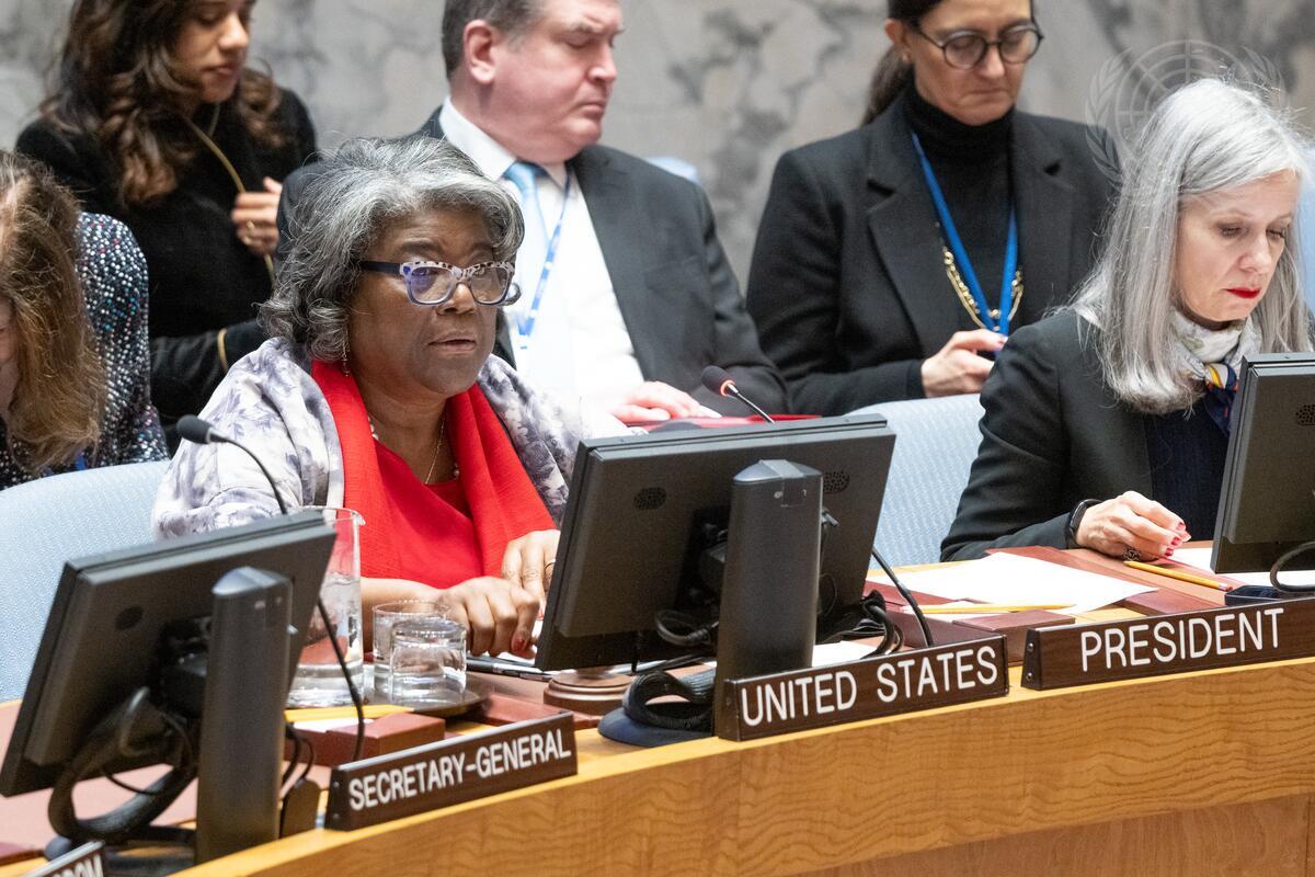 Linda Thomas-Greenfield (left), Permanent Representative of the United States to the United Nations and President of the Security Council for the Month of December, chairs the Security Council meeting on the situation in Afghanistan.