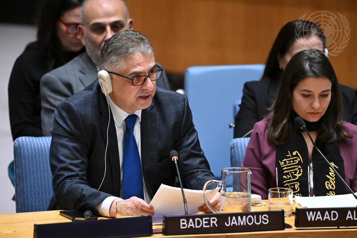 Bader Jamous (left), President of the Syrian Negotiation Commission, briefs the Security Council meeting on the situation in Syria.
