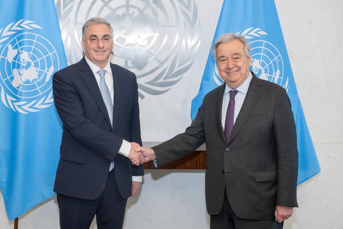 Francisco Fabián Tropepi (left), Permanent Representative of Argentina to the United Nations, presents his credentials to Secretary-General António Guterres.