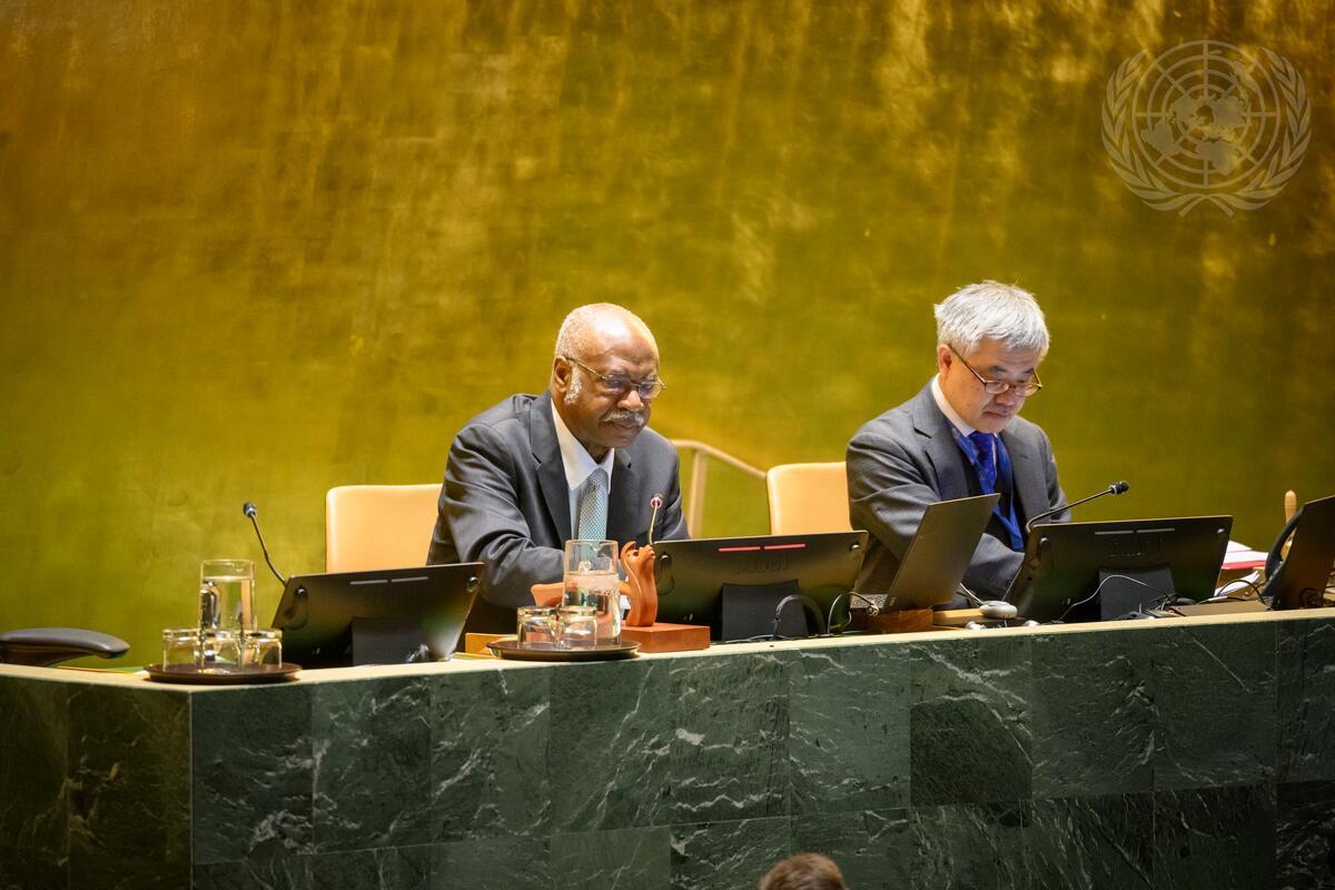 Philemon Yang (left), President of the seventy-ninth session of the United Nations General Assembly, chairs the 51st plenary meeting of the General Assembly on Oceans and the law of the sea. At right is Kenji Nakano, Chief of the General Assembly Affairs Branch, Department for General Assembly and Conference Management (DGACM).