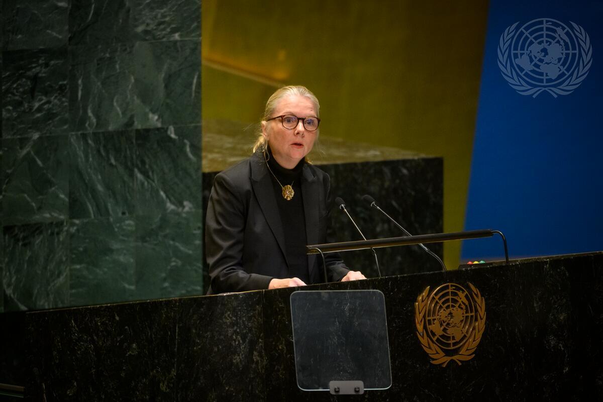 Nicola Jane Forbes Clase, Permanent Representative of Sweden to the United Nation, introduces a resolution on "Investigation into the conditions and circumstances resulting in the tragic death of Dag Hammarskjöld and of the members of the party accompanying him" during the 48th plenary meeting of the General Assembly.