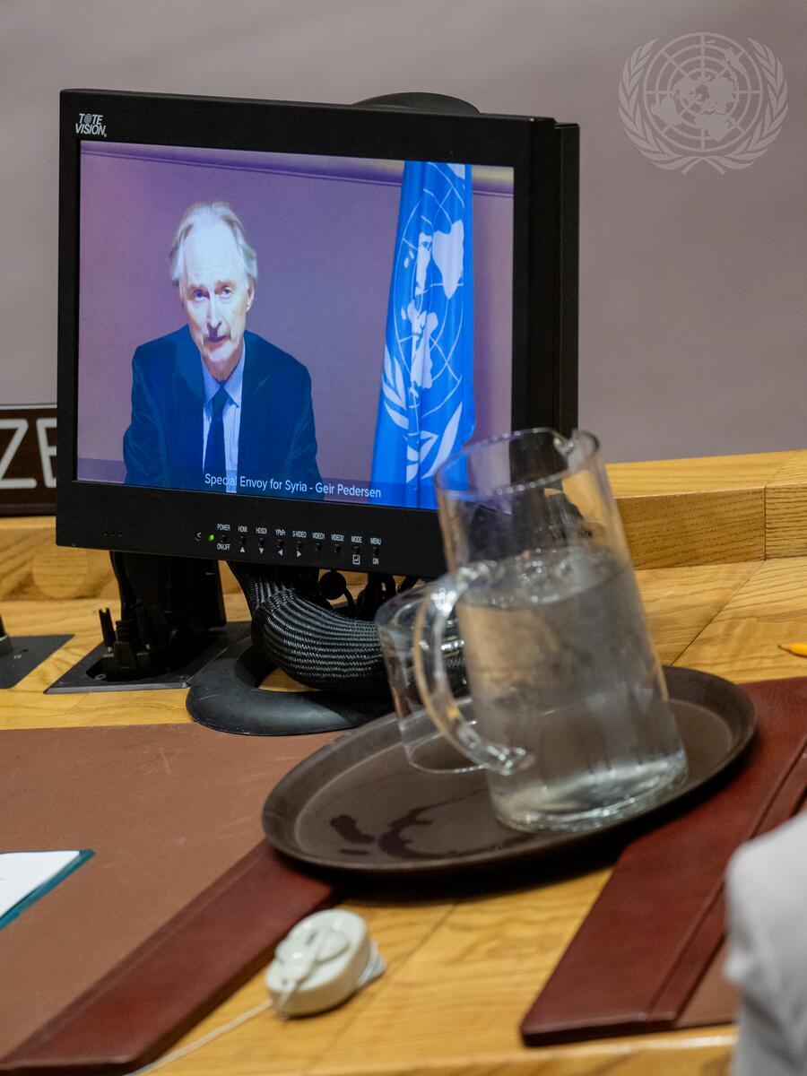 Geir Pedersen (on screen), Special Envoy of the Secretary-General for Syria, briefs the Security Council meeting on the situation in the Middle East (Syria).