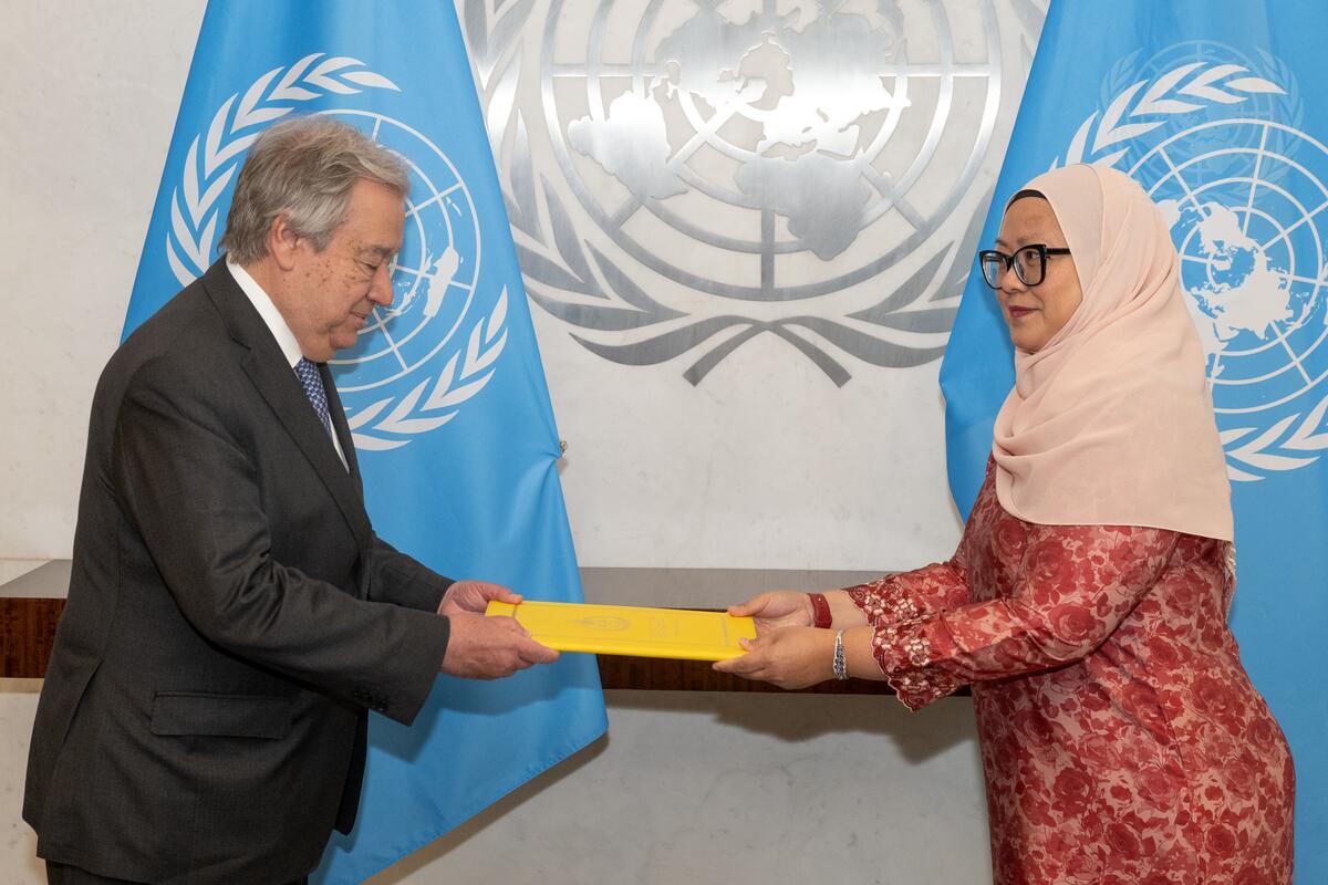 Pengiran Hairani Pengiran Haji Tajuddin (right), Permanent Representative of Brunei Darussalam to the United Nations, presents her credentials to Secretary-General António Guterres.