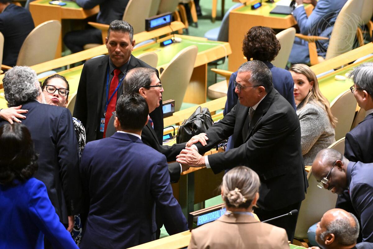 Bruno Eduardo Rodríguez Parrilla (centre left), Minister for Foreign Affairs of Cuba, greets delegates after the adoption of the resolution on the "Necessity of ending the economic, commercial and financial embargo imposed by the United States of America against Cuba" during the 30th plenary meeting of the General Assembly. The Resolution was adopted by recorded vote with 187 in favour; 2 against and 1 abstention.