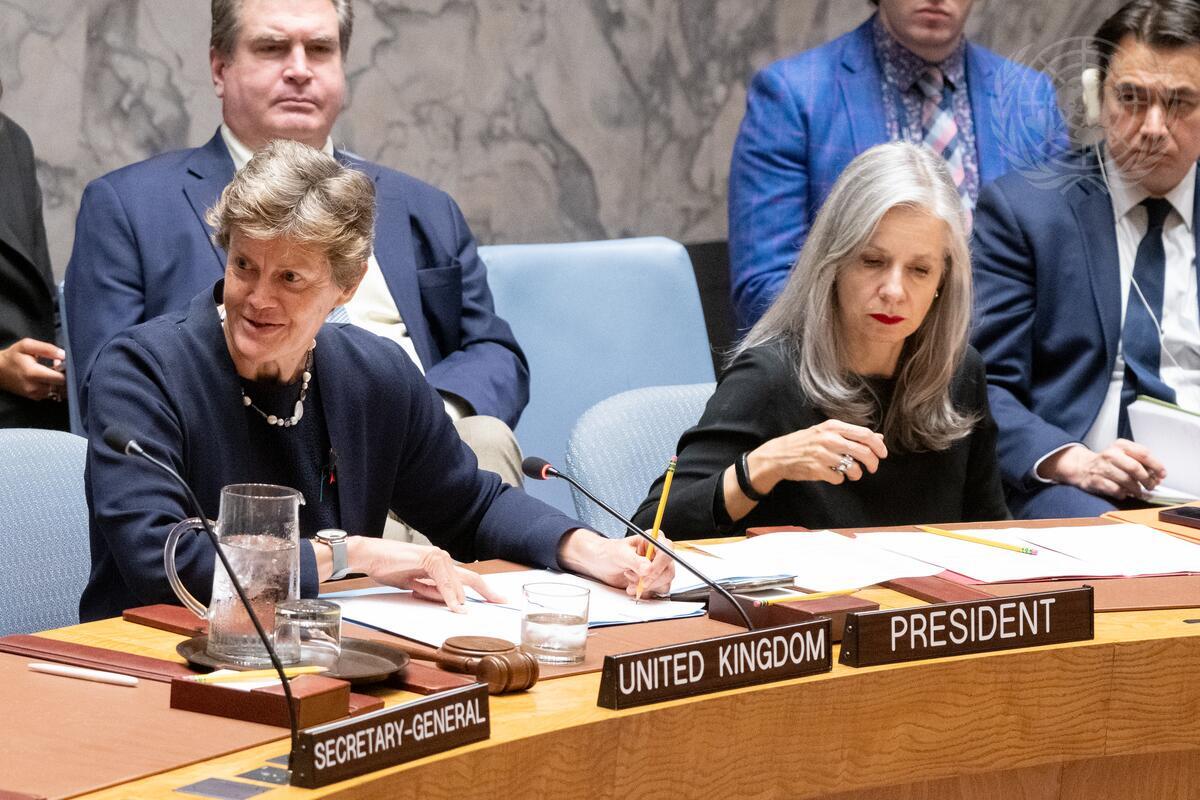 Barbara Woodward (left), Permanent Representative of the United Kingdom to the United Nations and President of the Security Council for the Month of November, chairs the Security Council meeting on the situation in Bosnia and Herzegovina. At right is Claudia Banz, Director of the Security Council Affairs Division of the Department of Political and Peacebuilding Affairs (DPPA).