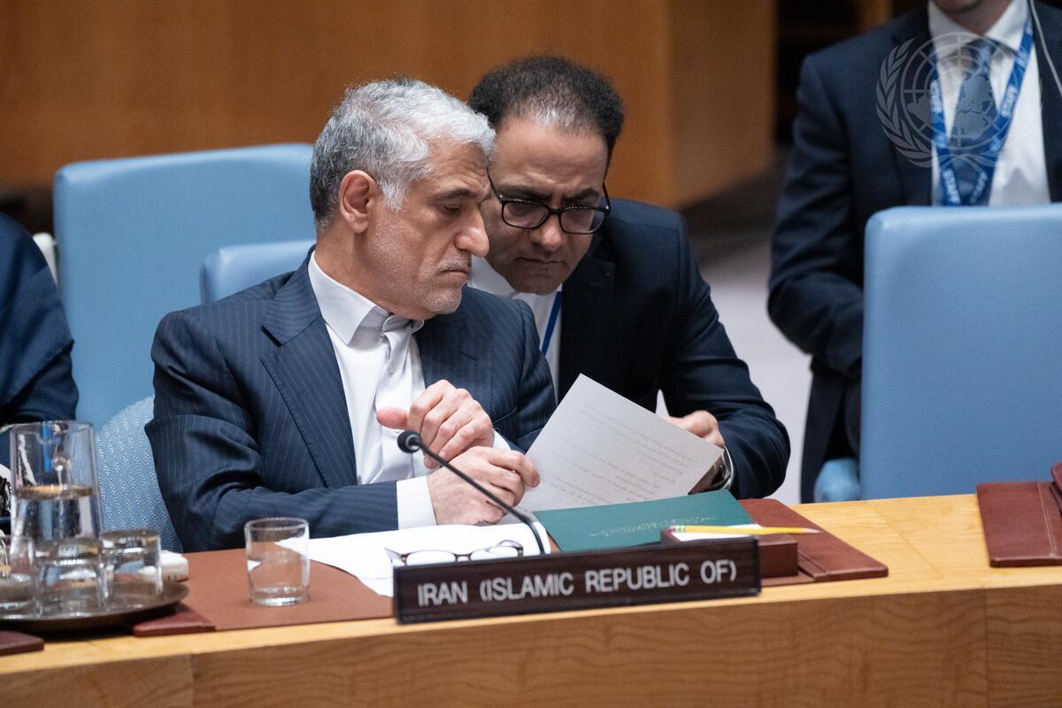 Amir Saeid Iravani (front), Permanent Representative of the Islamic Republic of Iran, speaks with a colleague during the Security Council meeting on threats to international peace and security.