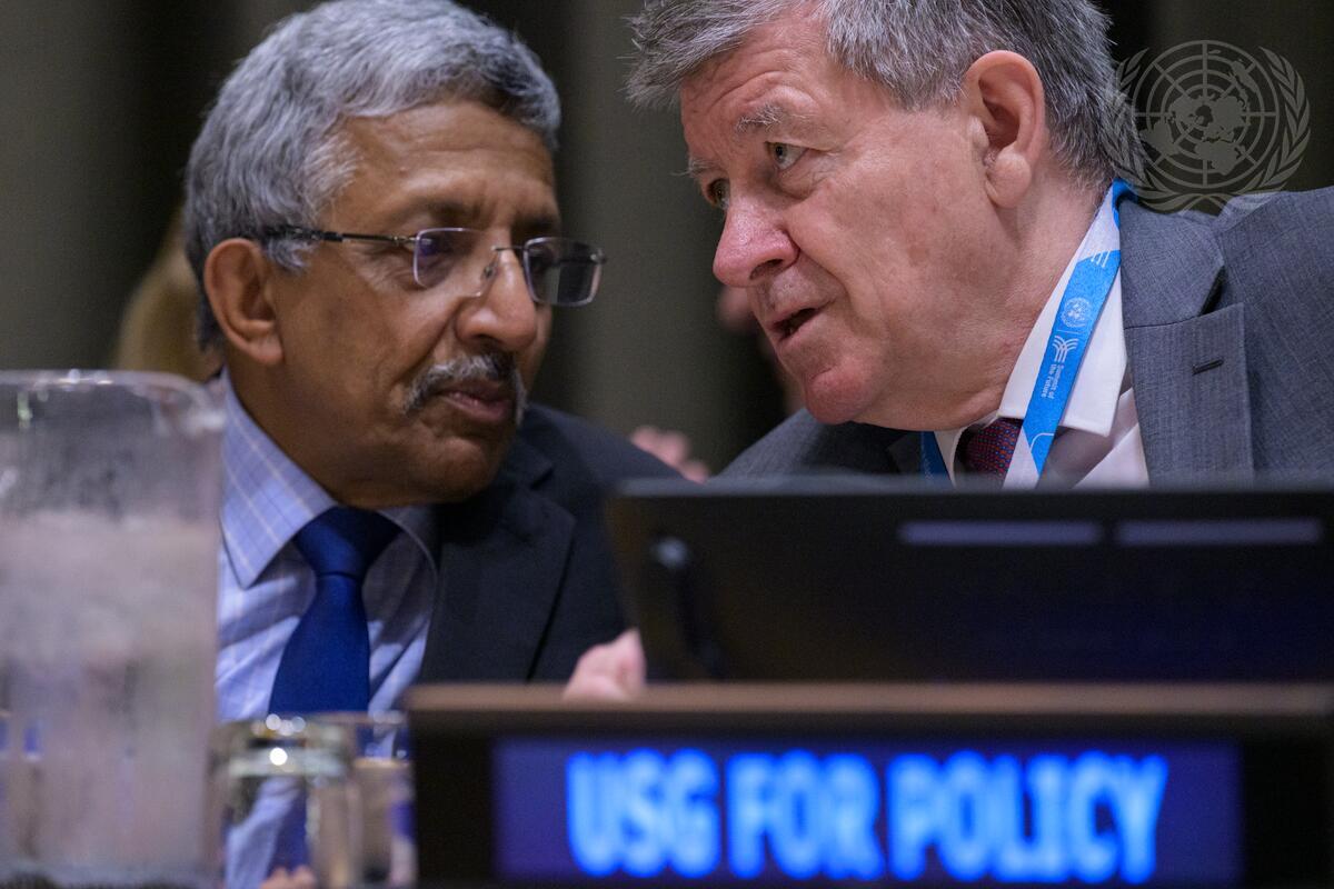 Guy Ryder, Under Secretary-General for Policy, speaks with Chandramouli Ramanathan, Controller and Assistant Secretary-General for Programme Planning, Finance and Budget of the Department of Management Strategy, Policy and Compliance, during the informal meeting of the General Assembly plenary to hear an update on the UN80 Initiative.