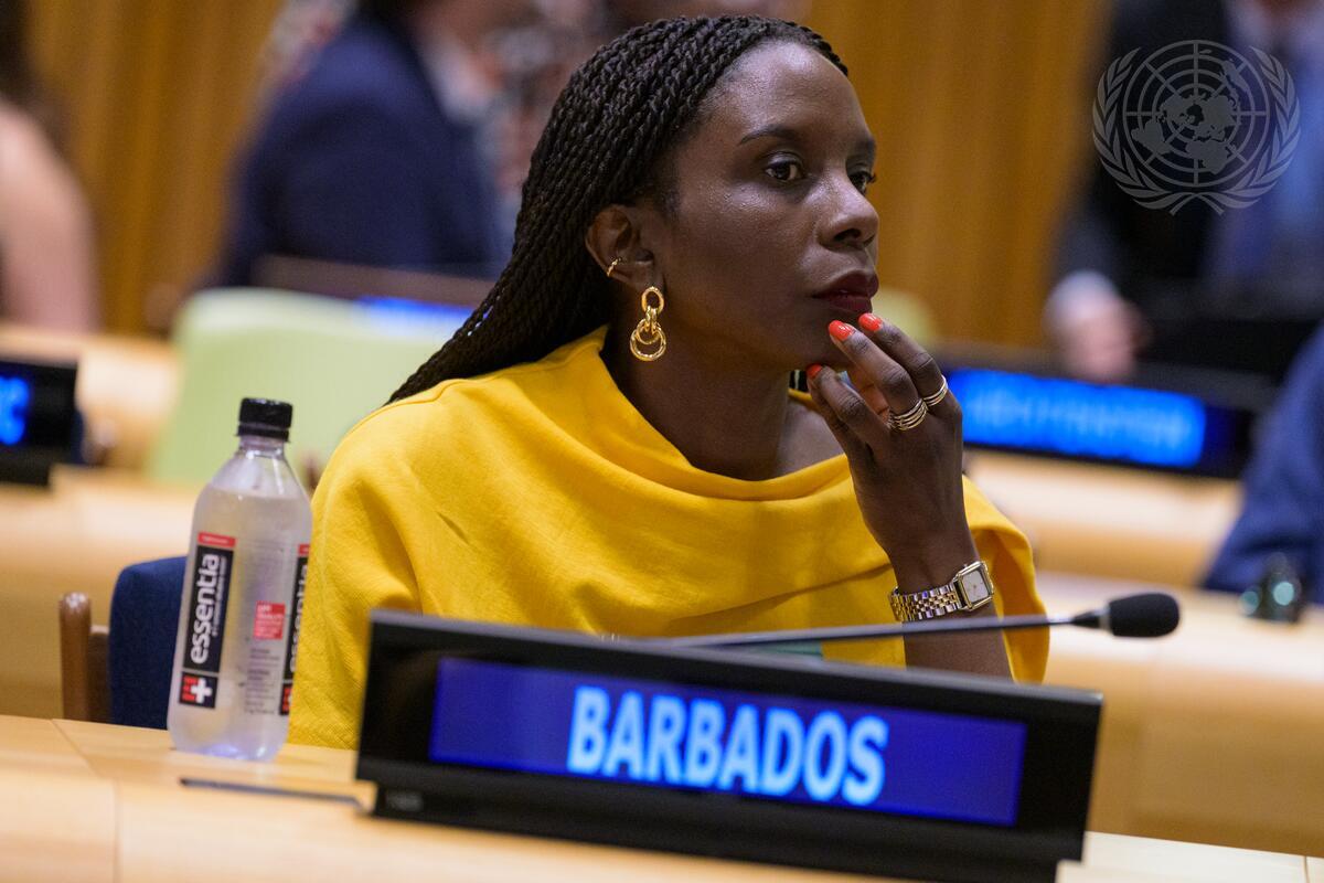 A delegate from Barbados attends the informal meeting of the General Assembly plenary to hear an update on the UN80 Initiative.