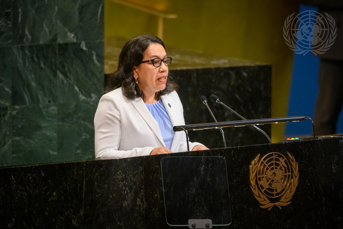 Carolyn Rodrigues-Birkett, Permanent Representative of the Cooperative Republic of Guyana to the United Nations and President of the Security Council for the month of June, addresses the informal General Assembly meeting of the plenary to commemorate the eightieth anniversary of the signing of the Charter of the United Nations.