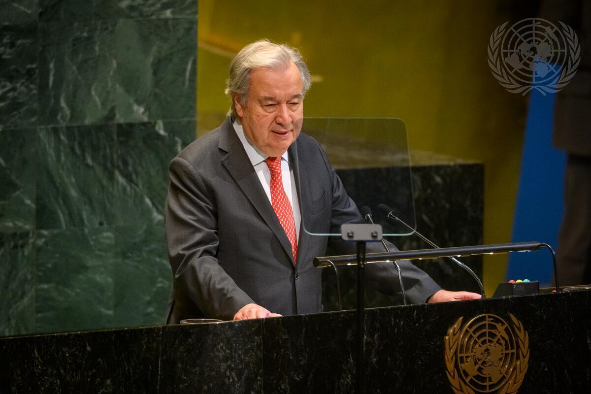 Secretary-General António Guterres addresses the informal General Assembly meeting of the plenary to commemorate the eightieth anniversary of the signing of the Charter of the United Nations.
