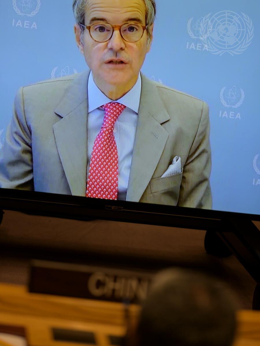 Rafael Mariano Grossi (on screen), the Director General of the International Agency for Atomic Energy (IAEA), briefs the Security Council meeting on threats to international peace and security.