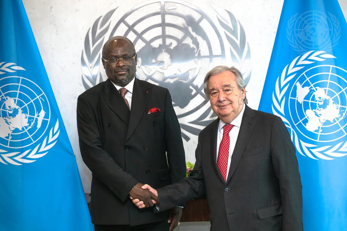 Secretary-General António Guterres (right) meets with Régis Michel M. Onanga Ndiaye, Minister for Foreign Affairs, Sub-Regional Integration and Gabonese Living Abroad of the Gabonese Republic.