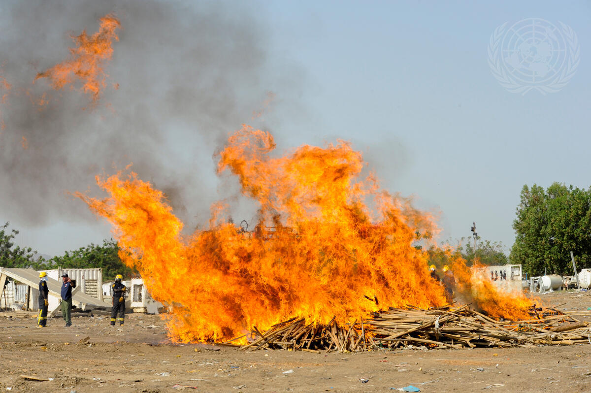 The Fire Unit of United Nations Mission in South Sudan (UNMISS) conducts a controlled bonfire of materials left over from the Protection of Civilians (PoC) site in Tomping UNMISS base.
