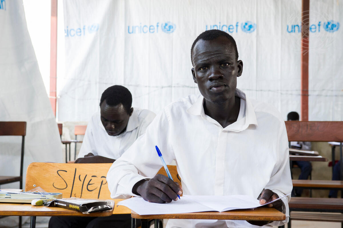 Students sit for South Sudan Secondary School Examinations in the Tomping Protection of Civilians (POC) site in Juba. The students have traveled from Unity State to Central Equatoria to take their exams due to fighting in their home state.