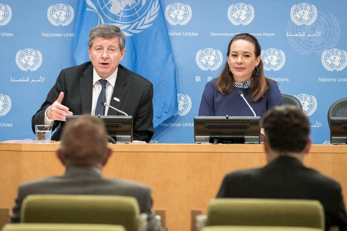 Guy Ryder (left), Director General of the International Labour Organization (ILO), briefs press together with María Fernanda Espinosa Garcés, President of the seventy-third session of the General Assembly, on the high-level Assembly meeting to commemorate the 100th anniversary of the establishment of the ILO.