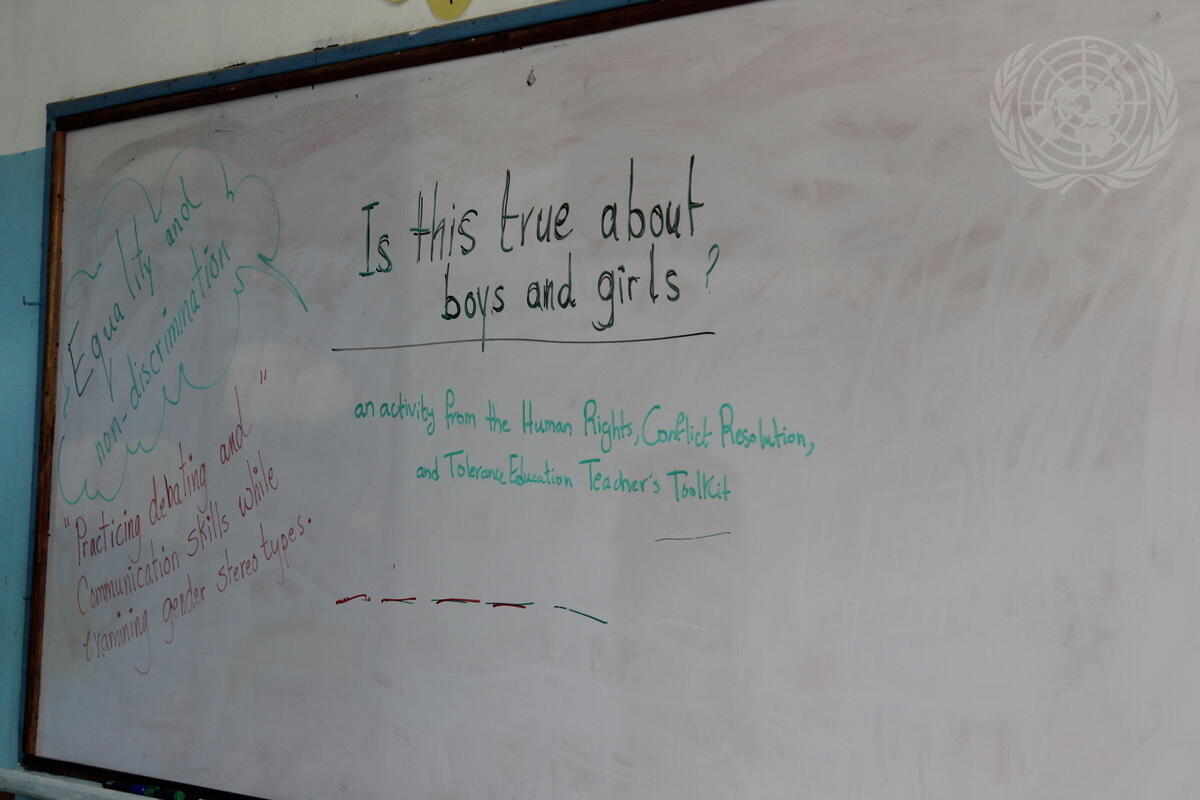 A view of a dry erase board a school run by the UN Relief and Works Agency for Palestine Refugees in the Near East (UNRWA) at Baqa’a Camp in Jordan, during a visit by Secretary-General António Guterres.