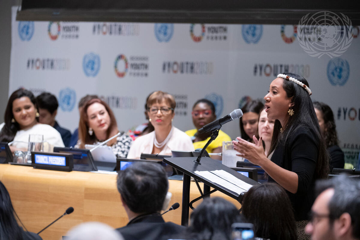 Yolanda Joab (right, at podium), Founder and Executive Director of Island PRIDE (Promoting Resilience through Involvement, Development and Education), delivers the keynote address during the opening session of the 2019 Economic and Social Council (ECOSOC) Youth Forum. The theme of this year's Forum is “Youth: Empowered, included and equal”.