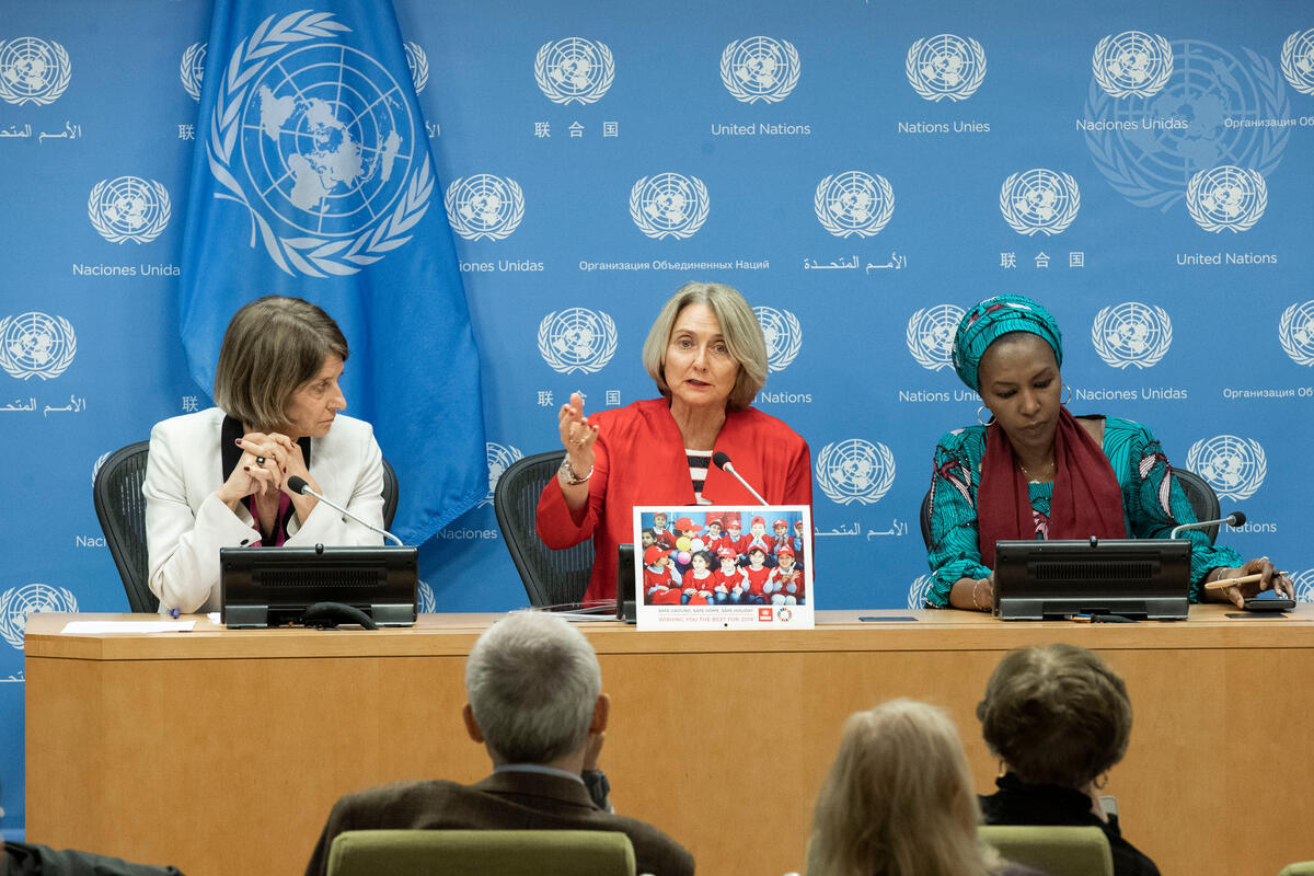 Agnès Marcaillou (centre), Director of the UN Mine Action Service (UNMAS), briefs press as guest at the noon briefing, on the occasion of the International Day for Mine Awareness and Assistance in Mine Action (4 April).