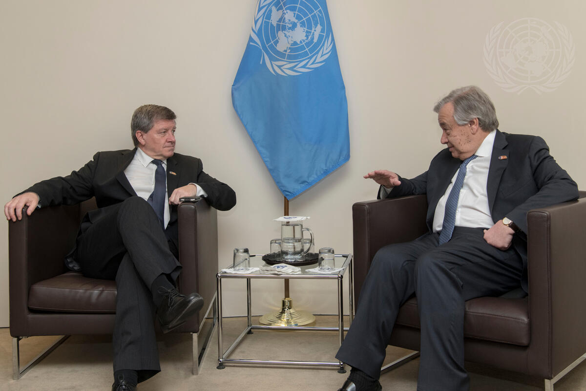 Secretary-General António Guterres (right) meets with Guy Ryder, Director-General of the International Labour Organization.
