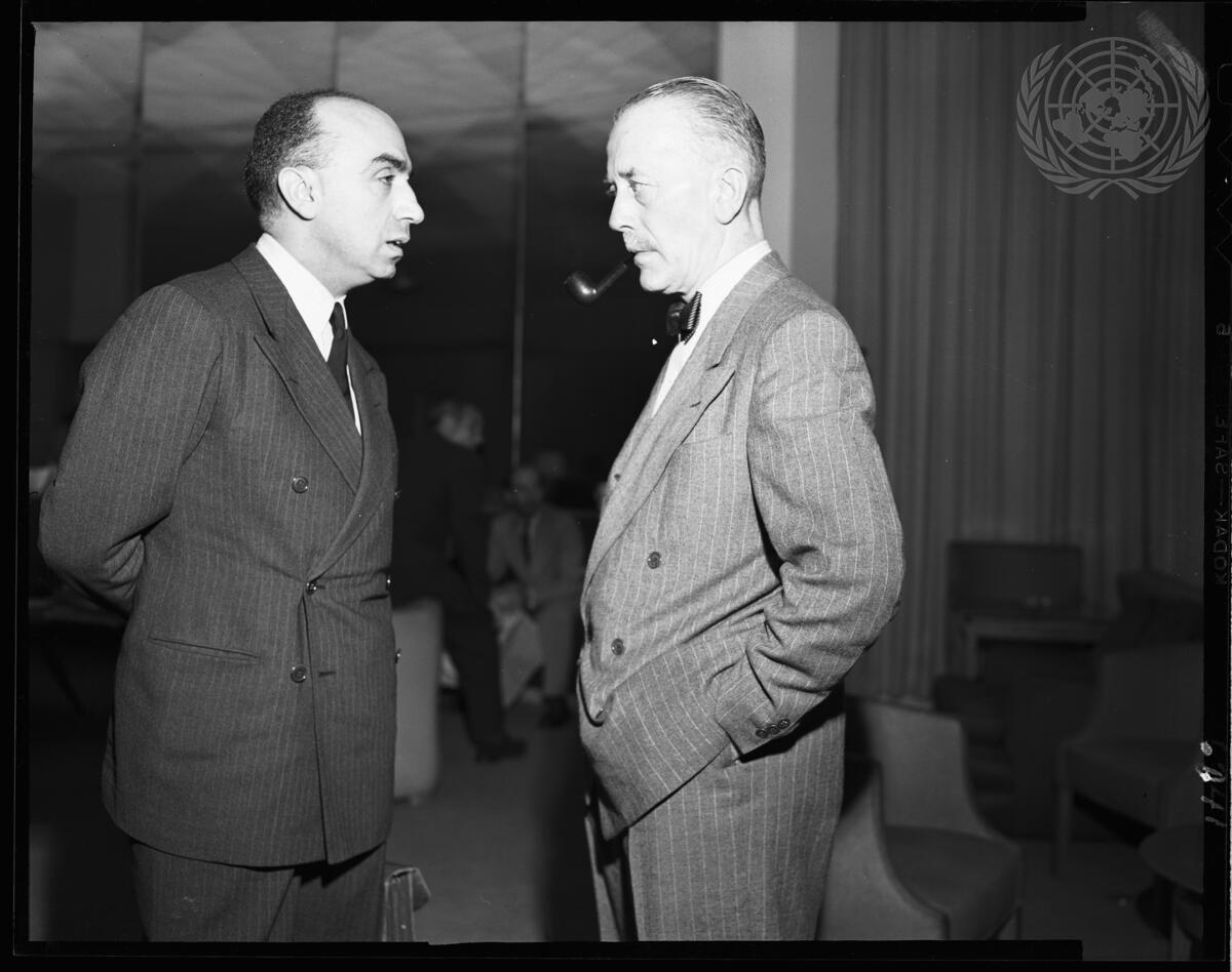 In the delegates lounge at the United Nations Headquarters in Lake Success before the 147th meeting of the Security Council at which discussion on theCommission of Investigation Concerning Greek Frontier Incidents report was begun. Alexis Kyrous (left), Greece, alternate representative to Council during the Commission discussions, chats with Sir Alexander Cadogan, permanent United Kingdom representative to the United Nations.