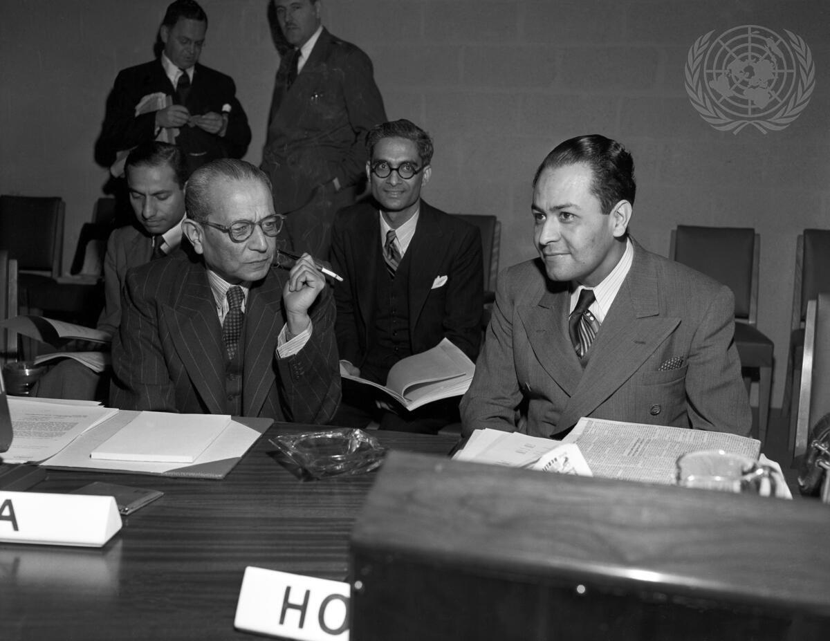 M. Asaf Ali, left, India, Ambassador to the United States and chairman of the delegation from his country to the First Special Session of the United Nations General Assembly convened at the request of the United Kingdom to consider the Palestine question, and Dr. Tiburcio Carias, Jr., Honduras, and chairman of the delegation from his country, at conference table before the first meeting of the General committee. Committee, under the chairmanship of Assembly Presidents Dr. Oswaldo Aranha, Brazil, is composed of seven Vice-Presidents and the chairmen of the six main committees. 29 April 1947.