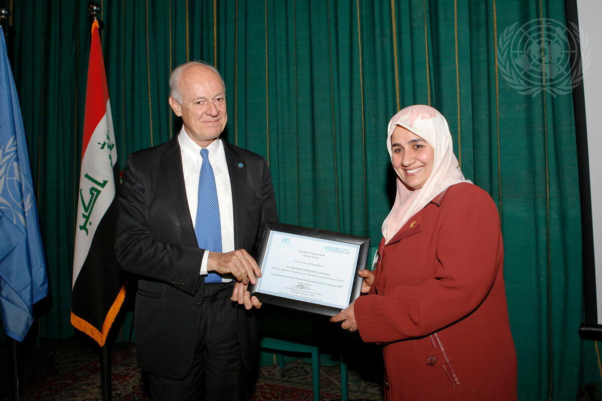 Staffan de Mistura (left), Special Representative of the Secretary-General and Head of the United Nations Assistance Mission in Iraq (UNAMI), presents a certificate of appreciation to a member of one of the civil society organizations for participation in the Electoral Education Campaign.