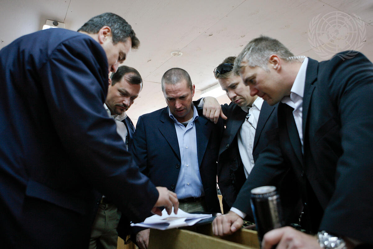 Members of the security team of the Special Representative of the Secretary-General and Head of the United Nations Assistance Mission in Iraq (UNAMI) review a document, as the Iraqis go to the polls for the provincial elections.