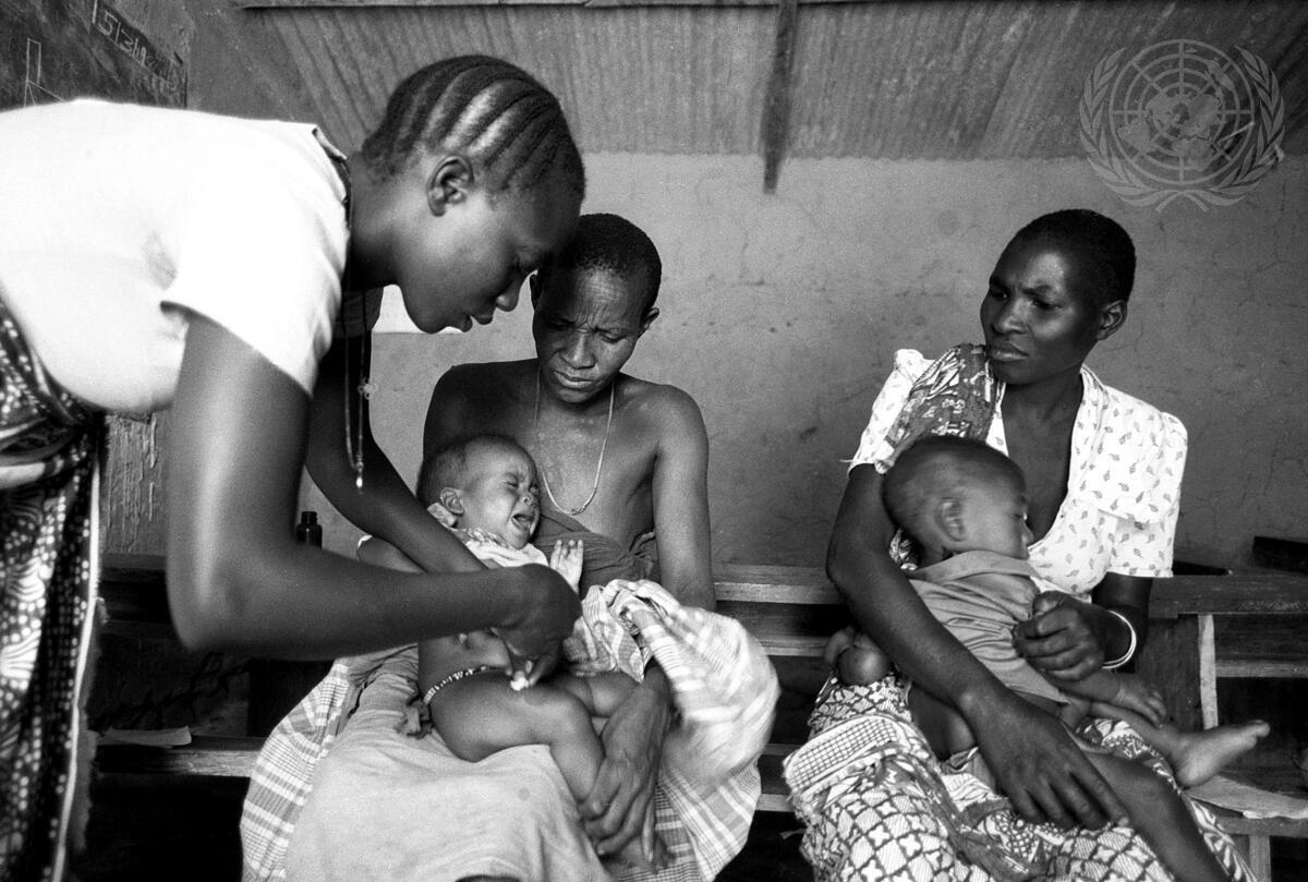 At a mobile clinic near Singida, a health worker immunizes a child against major childhood diseases. 1984.