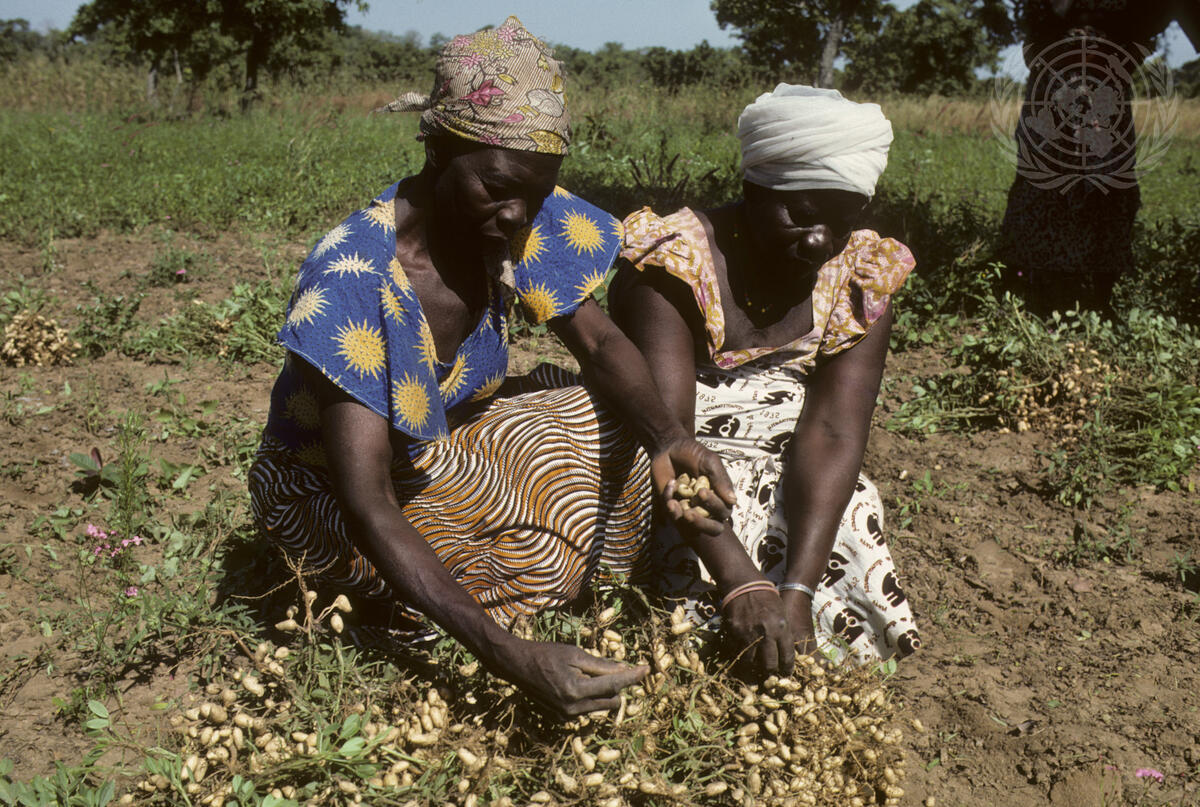 Women in the village of Pizonou harvesting peanuts, one of the principal crops in Upper Volta. [No exact date]